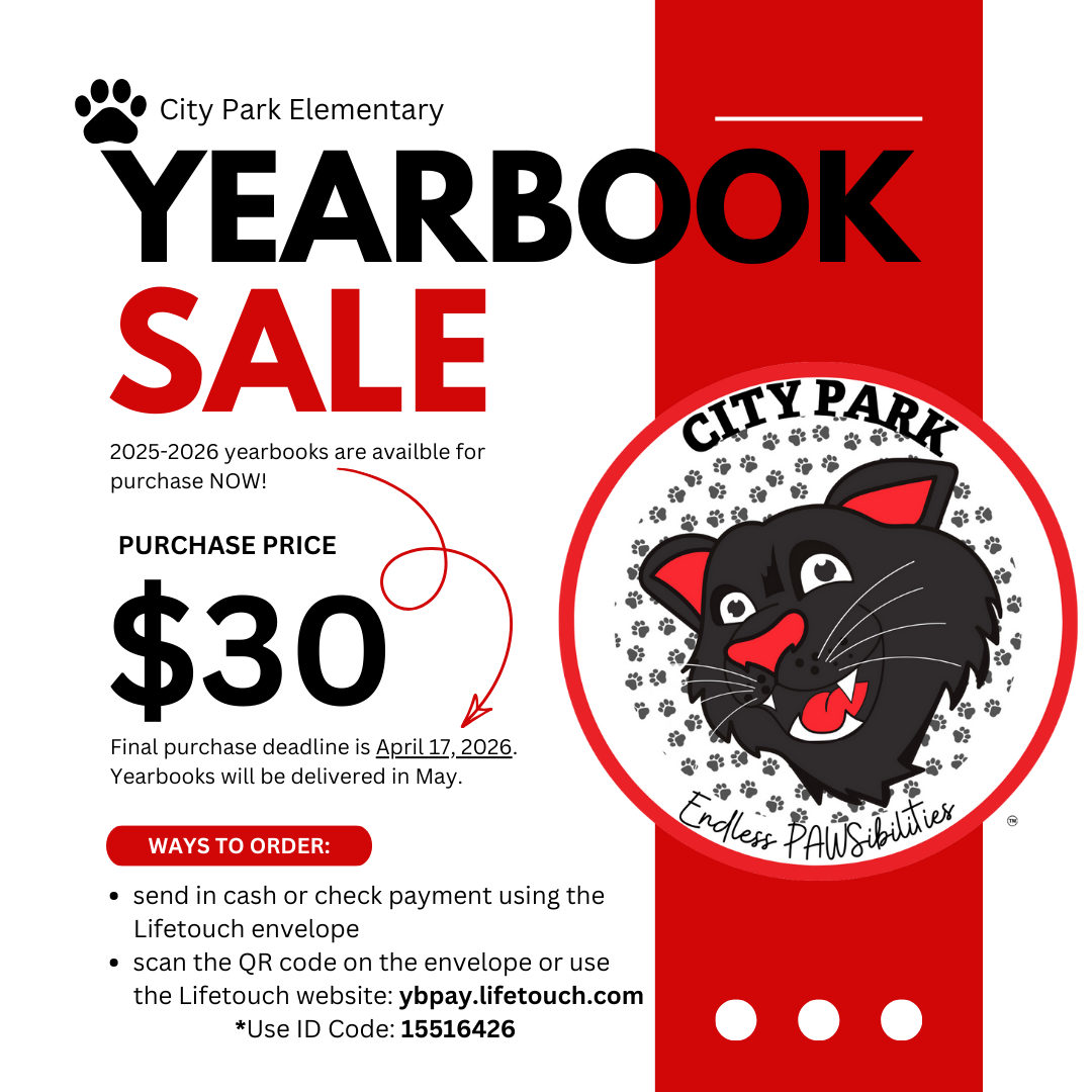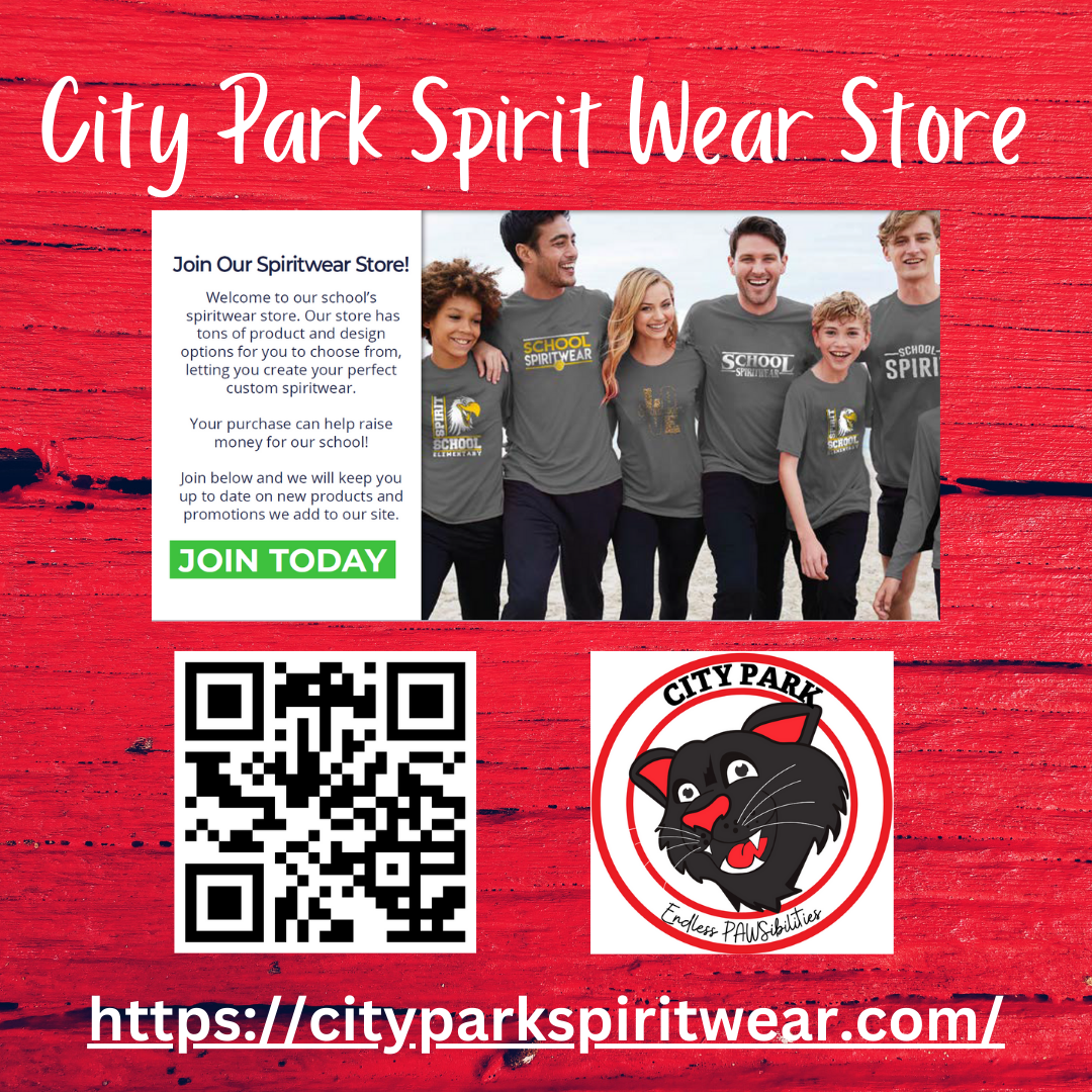 Our City Park Elementary Spirit Wear Store is open online at https://cityparkspiritwear.com/! Shop Panther tees, hoodies, hats, and cozy winter gear for the whole family. All items are shipped directly to your home, and all payments are made directly to the company—nothing is ordered, collected, or handled through the school. Wear your Panther pride to school events, Panther Fridays, and in the community. Thank you for supporting City Park Elementary! |